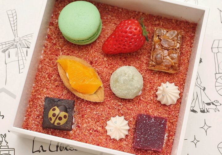 二の重はさまざまなひと口サイズのプティフール。フロランタンやマカロン、ブールドネージュなどの焼菓子のほか、季節のタルトやパートドフリュイ、テントウムシをあしらったかわいいチョコレートなどが並びます。