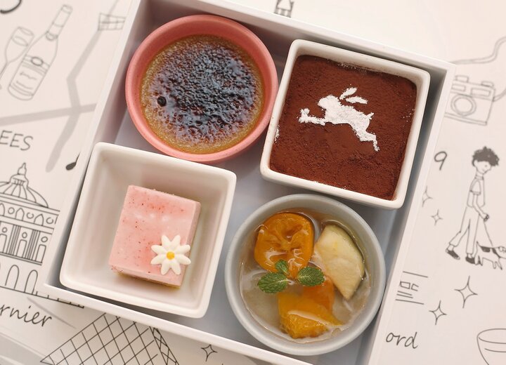 最後のお重は、冷たいデザートの詰め合わせ。ティラミスやクレームブリュレ、フルーツのゼリーやムースなど、こちらも季節を感じられるように仕立てています。ドリンクは紅茶はもちろん、シャンパーニュなどアルコールも取りそろえていますよ。