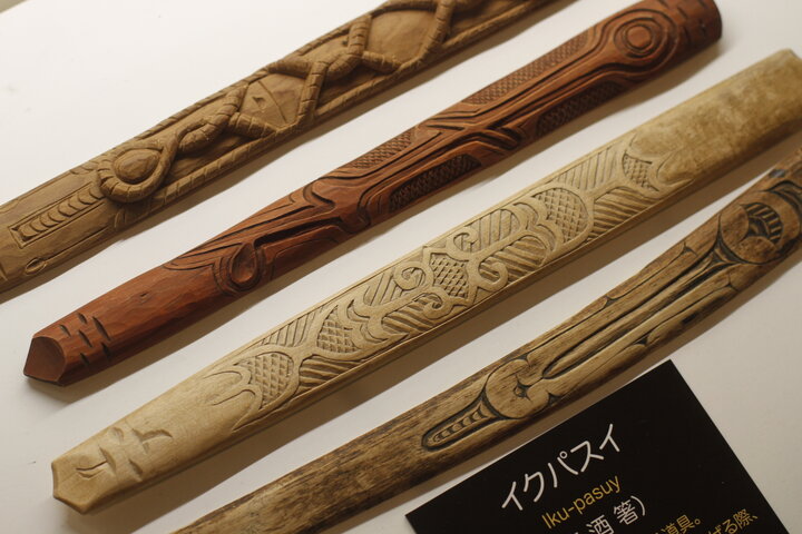 アイヌ民族では、神が姿、形を変えて人間界にやってきた化身を「カムイ(神)」と敬っています。イクスパイは、カムイに酒を捧げるときに使用する祭具で、表面には個性豊かな彫刻が施されています。いずれも1本の木から削り出していて、彫りが深く立体的です、漆が塗られたものや、動物が描かれたものなどさまざま。裏面は杯の上に載せるため、平らになっています。