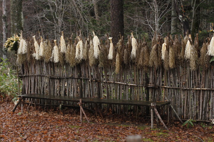 オンネチセの外には、秋のまりも祭りで使用したイナウという祭具が立てかけられています。イナウは祭りが行われる前に、ヤナギの木を削って一本ずつ製作。行事が終わった後も大事に祀られています。
