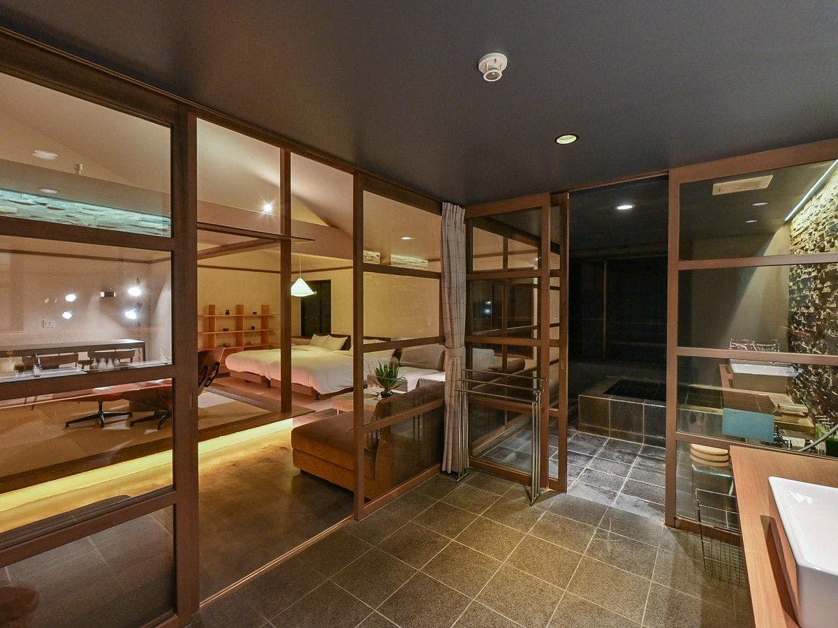お部屋は内子和紙やギルディング、内子杉などをふんだんに使用した、柔らかで趣のある数奇屋造りの建物。客室温泉は大きなガラス戸に囲まれ、解放感のある造りとなっています。大浴場は、地元の青石をふんだんに使用。四季の色に染まる景色の中、ただのんびりと時に寄り添い湯に遊ぶ、五感で感じる優しい時間を楽しむことができます。