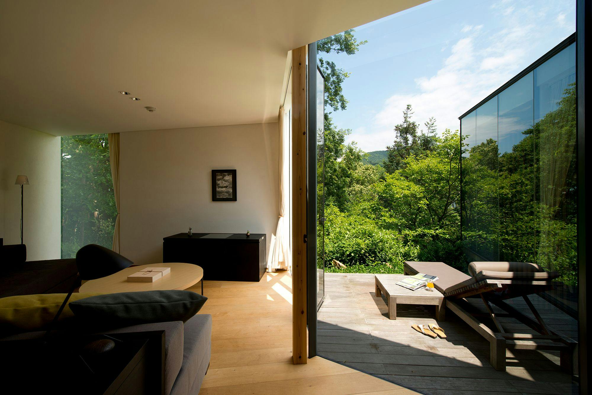 お部屋は内子和紙やギルディング、内子杉などをふんだんに使用した、柔らかで趣のある数奇屋造りの建物。客室温泉は大きなガラス戸に囲まれ、解放感のある造りとなっています。
