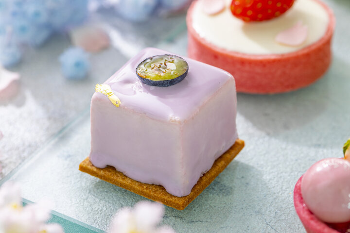 「ベリーとスミレのムース」は、ベリーにスミレが香る濃厚なムース。優しいバイオレットカラーに仕上げ、ブルーベリーを飾っています。まるでギフトボックスのような一品です。