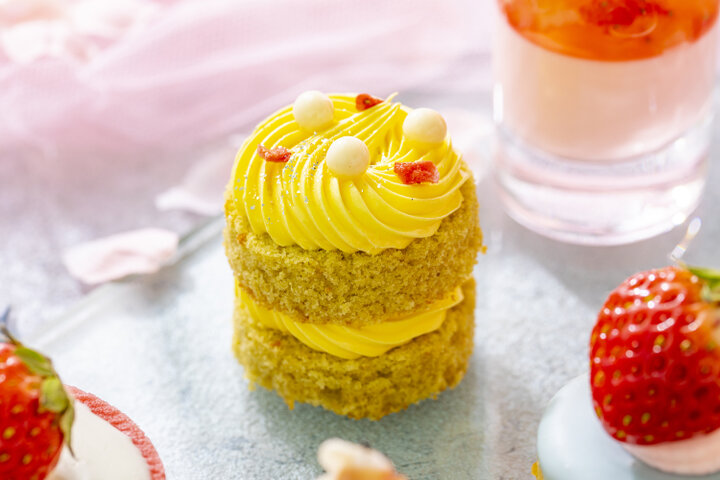 「ピスタチオとレモンのバターサンド」は、ライトグリーンのピスタチオのスポンジにキルシュ酒を効かせたシロップを浸み込ませ、レモン味のバタークリームをサンドしています。 酸味と甘味のバランスが絶妙な味わいです。
