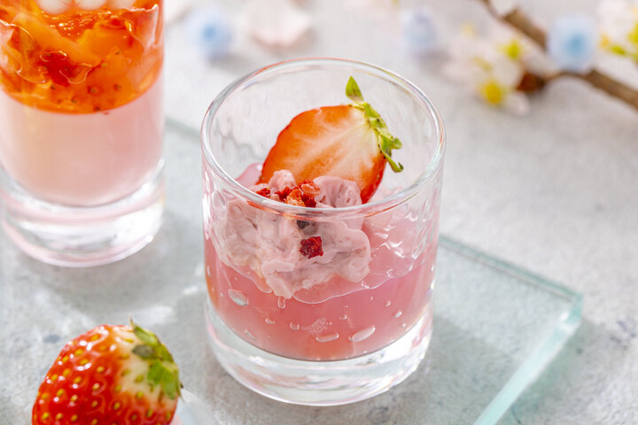 「いちごと桜のヴェリーニ」は、いちごのパンナコッタ、桜ゼリー、サクサクとした食感が良いアクセントになったパールのクッキーを重ね、トップにメレンゲを飾っています。 春の香りが口いっぱいに広がる一品です。