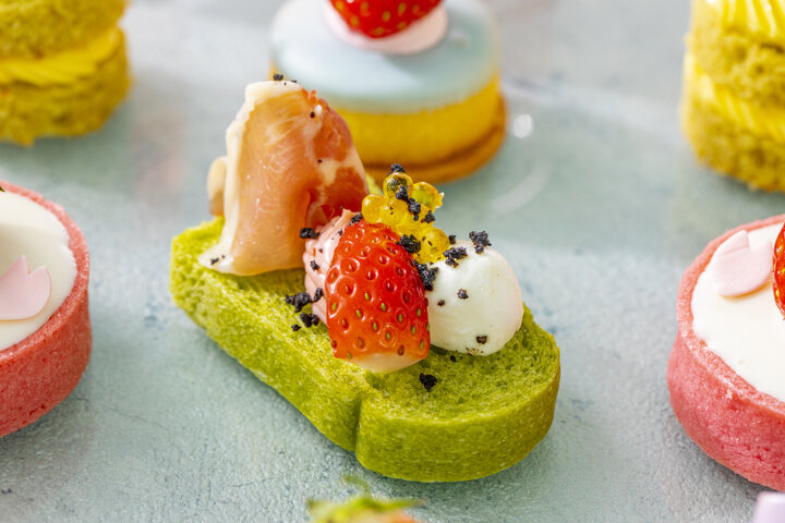 「生ハムといちごの桜香るクロスティーニ」は、ルッコラのトーストの上に、桜マスカルポーネクリーム、ふわとろのモッツァレラチーズ、生ハム、いちごを盛り付けています。 アクセントにドライブラックオリーブパウダーとオリーブオイルのパールをトッピングしています。