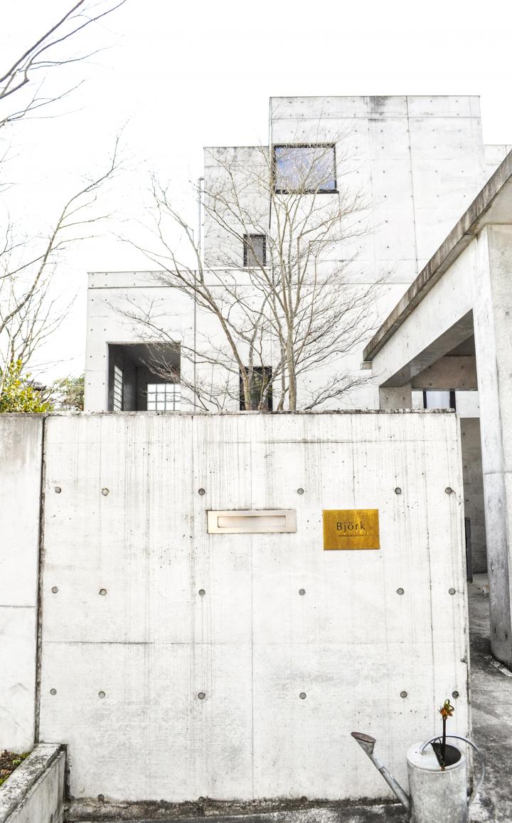 コンクリート打ちっぱなしの建物と、ゴールドの表札が目印