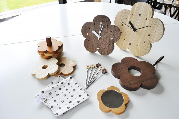 「ビヨルクオリジナルの木製シリーズ KUKKA(お花)」。時計6318円~、ポットマット1944円、コースター(1枚)756円など