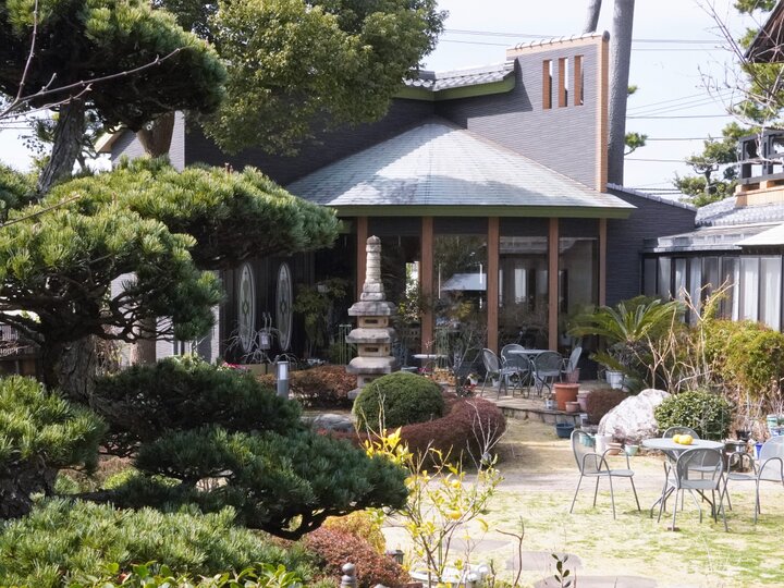 定期的に庭師さんが手入れをする庭は緑をたたえる松をはじめとして梅や桃、シャクヤク、アジサイなど季節の花々が咲き、その中を放し飼いの2羽のニワトリが歩き回る光景も見られるなど、のどかな空気が流れます。