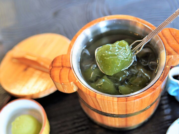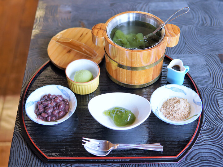 ステキな雰囲気の中でいただけるのはコーヒーなどのカフェメニューやみたらし団子などの甘味、なかでもおすすめがモロヘイヤ入りのわらび餅「善乃園看板息子わらび餅」です。 粉末のモロヘイヤをたっぷりとわらび餅に練り込んだゆでたてを氷水で引き締めたツヤツヤの緑色をしたわらび餅。プルンとした程よい弾力があり抹茶アイスクリーム・小豆・黒蜜・自家製きな粉を自由にトッピングしながらいただきます。 自家製きな粉は黒ゴマと白ゴマ、ピーナッツ、カシューナッツなどをミキサーで細かく砕いてきな粉に混ぜ合わせていて、お口に入れると香ばしい風味が広がります。いろいろな味付けを楽しんで。
