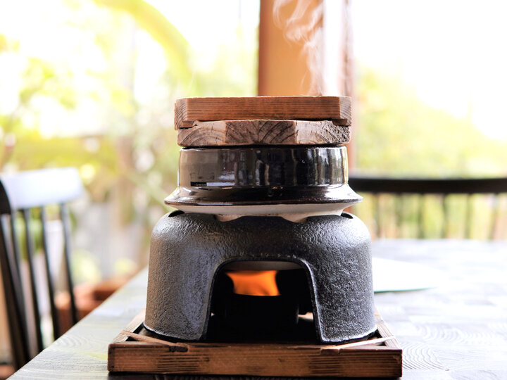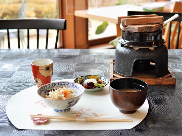 ランチで訪れるなら玄米ご飯を小さなお釜で炊く「玄米釜めし」がおすすめです。一人分ずつテーブルに用意したお釜に火をつけ、25分ほどで炊き上がります。その間はお庭を見ながら待つもよし、お庭を散策するもよし、のんびりと炊きあがりを待つ楽しいひと時です。