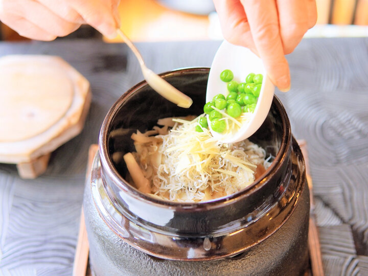 炊きあがって蓋を開けると香ばしいかおりが漂い、ニンジンやゴボウなど具沢山の中にさらにたっぷりの針生姜とグリーンピースを加えてかき混ぜます。お釜の底のおこげまでも美味しい釜めしは茶碗に3膳分ほど。漬物や温かいお味噌汁と一緒に召し上がれ。