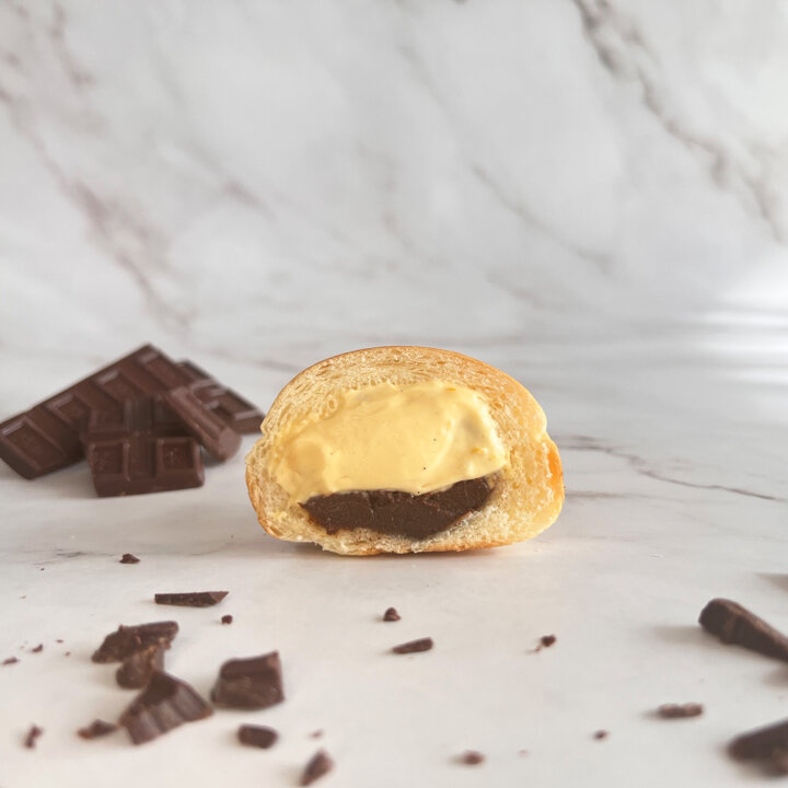 「ショコラ」は、そのまま食べても美味しいトリュフチョコを、贅沢にまるごとカスタードで包み込んでいます。 甘さとカカオの程よい香りが合わさった、大人な商品になっています。