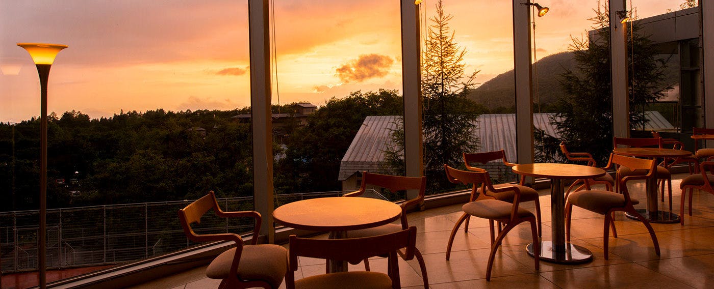 世界的な建築家、故・丹下健三が設計したデザイナーズリゾート「たかみや 瑠璃倶楽リゾート」。特徴的な外観と、アーチ状のレストランがリゾート感を演出しています。家具のコーディネイトは工業デザイナー・奥山清行氏によるもので、世界に誇る二人の意匠が融合した真のラグジュアリーと、心なごむホスピタリティを堪能できます。 大浴場「SPA由瑠璃」は源泉掛け流しで、24時間入浴が可能です。温泉の効能は神経痛・疲労回復はもちろん、古くから美人作りの湯として知られ、美肌効果も抜群です。 ラウンジ ヒルサイドテラスの大きな窓から眺める四季折々の風景は、まるで1枚の絵画を見ているような、贅沢な気持ちにさせてくれる空間。テラスから見る夕日は自慢の景色の一つです。