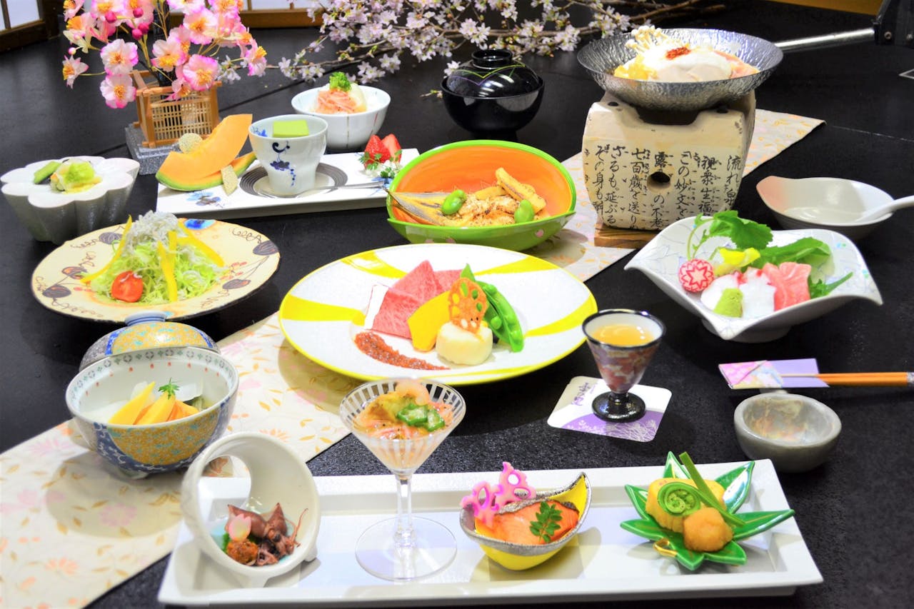 蔵王温泉街の高台にあり、日本百名山「蔵王連峰」を眺望できる抜群な環境にたたずむ「蔵王温泉 和歌(うた)の宿 わかまつや」。標高約880m、蔵王火山中腹の高原に涌き、古くは「蔵王高湯」として奥羽三高湯の一つに数えられ、郷土の歌聖・斎藤茂吉が「霊泉」と讃えた名湯を堪能できます。 お風呂は、御影石の「源泉内風呂」・「露天風呂」に加え、18tの蔵王・目透き石をくり抜いた「大石くり抜き露天風呂」に「貸切家族風呂」を備えており、すべてが源泉100%かけ流しの本物の温泉です。 夕食は、旬と郷土食材にこだわった和風会席料理を。定番の山形牛はもちろん、この地ならではの風味を堪能できます。