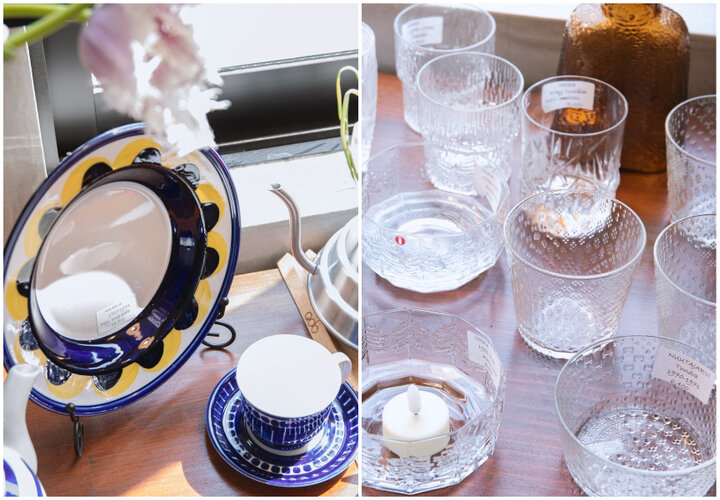 すてきなヴィンテージ品はまだまだあります。写真左側のイエローやコバルトブルーが美しいこれらは、1970~1972年に製造された「スーププレート」と、1960年代に作られた「コーヒーカップ&ソーサー」です。作られてから50年以上が経った現在でもツヤや鮮やかさがあり美しいです。写真右側のこちらは、フィンランドを代表するデザイナー・Oiva Toikka(オイバ・トイッカ)がデザインした「グラス」です。凍原の夏の雪解けを表現した繊細なデザインで、アイスクリームやフルーツなど、ちょっとしたスイーツを入れるのにちょうどいいサイズ感だそう。