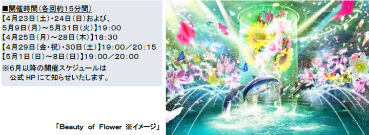ナイトver.「Beauty of Flower(ビューティ オブ フラワー)」は、花が咲き、蝶が舞い、光あふれる可憐な“初夏の海”が舞台です。 MCを入れず、水(噴水、ウォーターカーテン)・光(ムービングライト、水中照明)・映像(プロジェクションマッピング)・音(12.1chサラウンド)などの最先端テクノロジーによる演出のみで展開することで、イルカたちの迫力あるパフォーマンスをより引き立て、世界観へのさらなる没入を体感できます。 目前で繰り広げられる、イルカたちの美しい躍動と幻想的なシーンの数々に引きこまれることで「深い感動」を味わうことができます。 チケットなど詳細は、公式サイトをご覧ください。 「海の世界×デジタルフラワー」が織りなす“初夏の絶景”と“7つのハピネス体験”を、この機会にぜひ楽しんでくださいね。