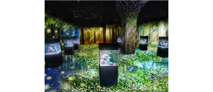 フロアに並ぶ11本の水槽には、森に棲む小動物や鳥の名前にちなんだ生きものを展示し、四方を囲む3.6mの壁や床面には、風にゆれる花々と緑、生い茂る樹木を投影。映像は木々の合間から光が差し込む日中の様子から、神秘的な夜へとゆっくり変化します。さらに、草木がなびくサウンドやフローラルなアロマも取り入れ、視覚だけでなく、音や香りの演出も同時に体感することで、まるで森林浴をしているかのような気分に浸れます。