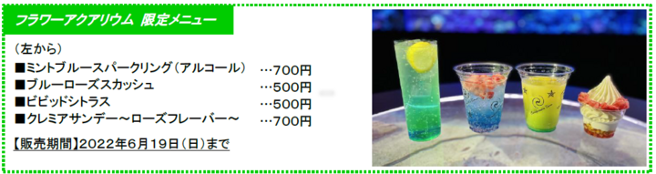 こちらでは、ブルーやイエローなど花々の美しい色合いをイメージした「フラワーアクアリウム」限定メニューを4種類用意し、ゲストの「味覚」を満たします。 また、感染対策の一環として、提供カウンター横には、手指消毒をエンターテインメント化した「NAKEDつくばいTM」を設置。手のひらに花びらが舞い、同時にアルコールが噴霧されます。