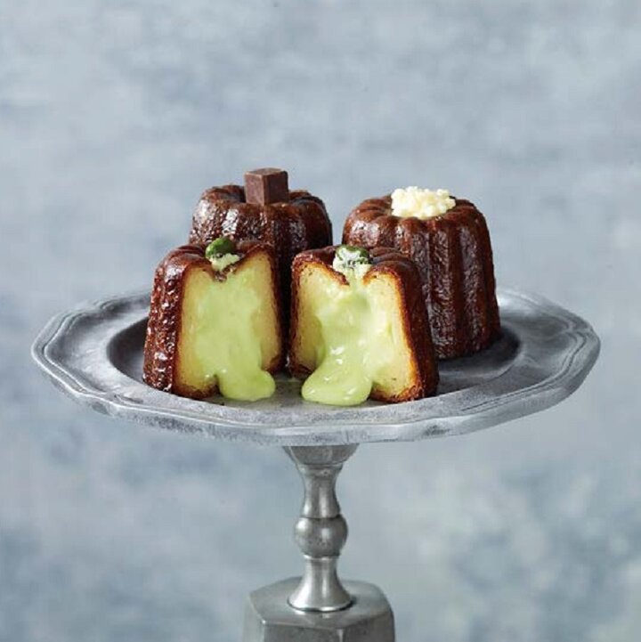 大阪「フランシージェファーズ」(通期、初登場)の「生カヌレセット(ベルギーチョコ・カスタード・ピスタチオ)」は、バニラとラム酒香る生地を、外はサクッ、中はしっとりもっちり食感に焼きあげたカヌレです。 そのまま食べても美味ですが、軽く温めると、中のクリームがとろけて新感覚の食感に。