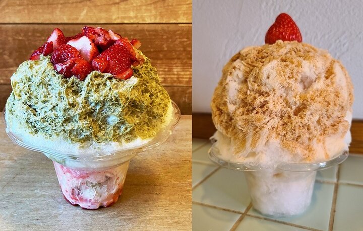 ふわふわできめ細やかな氷で人気を博す岐阜の名店「茶屋赤鰐(あかわに)」(4月26~28日、初登場)からは、春らしい味わいの日替わりメニューが登場します。 ●[4月26日(火)]さくらミルクとイチゴ ●[4月27日(水)]ピスタチオミルクとイチゴ(写真左) ●[4月28日(木)]ミルク杏仁とイチゴ 愛知「HAU(はう)」(4月29日~5月2日、初登場)の「犬山げんこつ」(写真右、4月29・30日)は、オリジナルのミルクにきな粉をまぜ、愛知県犬山市名物の「げんこつ飴」をイメージしたかき氷。ふくよかなきな粉の香りを楽しめます。 また、5月1・2日は「ほうじ茶ミルク金時」が登場します。