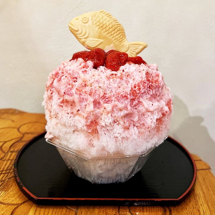 大阪「大阪浪花家」(後半、初登場)の「練乳いちご」は、西武池袋本店限定。練乳苺シロップの上に、苺のコンフィチュールと鯛型最中をトッピングしています。