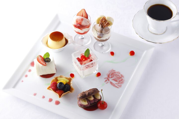 「資生堂パーラー物語」(コーヒーまたは紅茶またはハーブティー/カップサービス)は、平日限定・数量限定のメニューです。 さまざまなデザートを少しずつ楽しめる、色鮮やかなデザートプレートです。