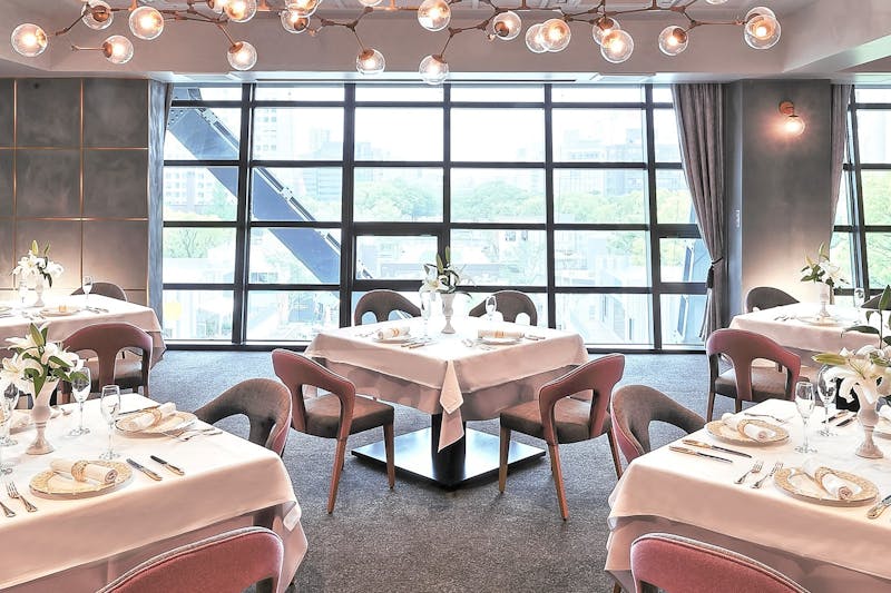 栄駅からすぐ。「ザ タワーホテル ナゴヤ」の2階にある「lily(リリィ)」でゲストを迎えるのは、眼下に広がる、緑豊かなセントラルパークの眺望。登録有形文化財の歴史と重厚さを感じさせるモルタルの壁に、ゴールドと淡いピンクを基調にしたインテリアはどこか懐かしく、ほっとできる。そんな温かな空気に包まれる空間です。