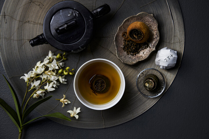 京都に店を構える「7T+(セブンティープラス)」からは、小⻘柑(シャオチンガン)という、熟す前の柑橘の果肉をくり抜き、プーアル茶を詰めた中国茶が登場します。