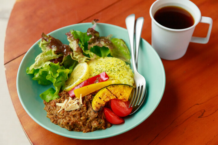 スイーツメニューのほかに、コーヒーに合うフードメニューもあります。 こちらは自家栽培のお米や野菜を使用した「キーマカレー」です。レタスやトマト、カボチャ、パプリカ、ドライタマネギなど、採れたての新鮮野菜がたっぷりと盛られており、見た目も鮮やか。ほんのり辛味のあるカレーも絶品で、レモンをかけるとさっぱりとした味わいへと変化します。