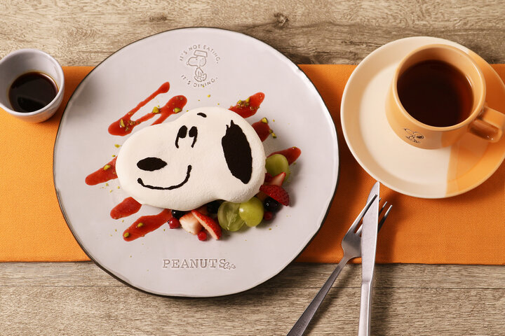 スヌーピーのデザインが可愛い米粉を使用したパンケーキは、メレンゲが入ってふんわりした仕上がりに。口当たり滑らかな豆乳クリームともっちり食感が相性抜群です。