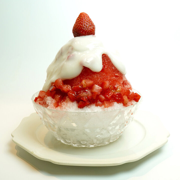 「やわもちのいちご大福かき氷《緑茶付き》」は、濃厚ないちごソースととろっとした求肥ソースをトッピングした、まるでいちご大福のようなかき氷です。