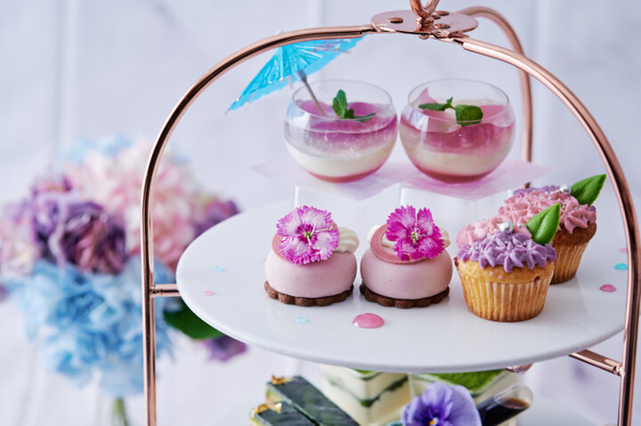 「紫陽花&抹茶アフタヌーンティー」は、初夏の風物詩ともいえる“紫陽花”の華やかな色合いと、香り豊かな抹茶の風味を堪能できる和洋折衷のアフタヌーンティーです。