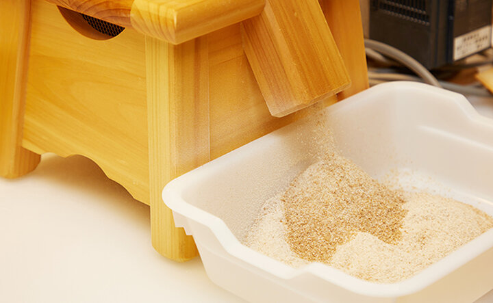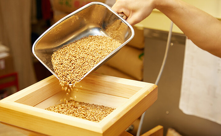 「サワードゥは北海道の有機栽培の小麦を仕入れ、実際にお店の中の石臼で引いています。基本的には粉の状態で仕入れているんですが、このパンに関してはお店で引いて、天然酵母とあわせて焼く、ハワイの田舎パンになっています」と教えてくれた小森さん。実際に石臼で小麦を引いている様子を見せてくれました。