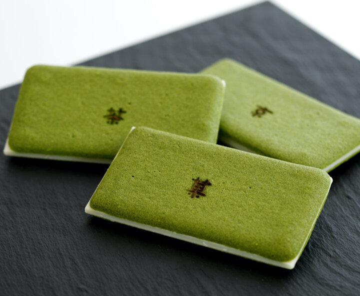 「お濃茶ラングドシャ『茶の菓』」は、京都 宇治 白川の厳選茶葉をはじめとする宇治茶を使用。色・味・香りを極めたお濃茶を、シェフの技と五感で繊細な口どけのラングドシャに。ミルク感豊かなオリジナルのホワイトチョコレートを挟み、<山の茶葉>の香りと深みある風味を際立たせています。 国内外で愛される、京都土産の定番です。