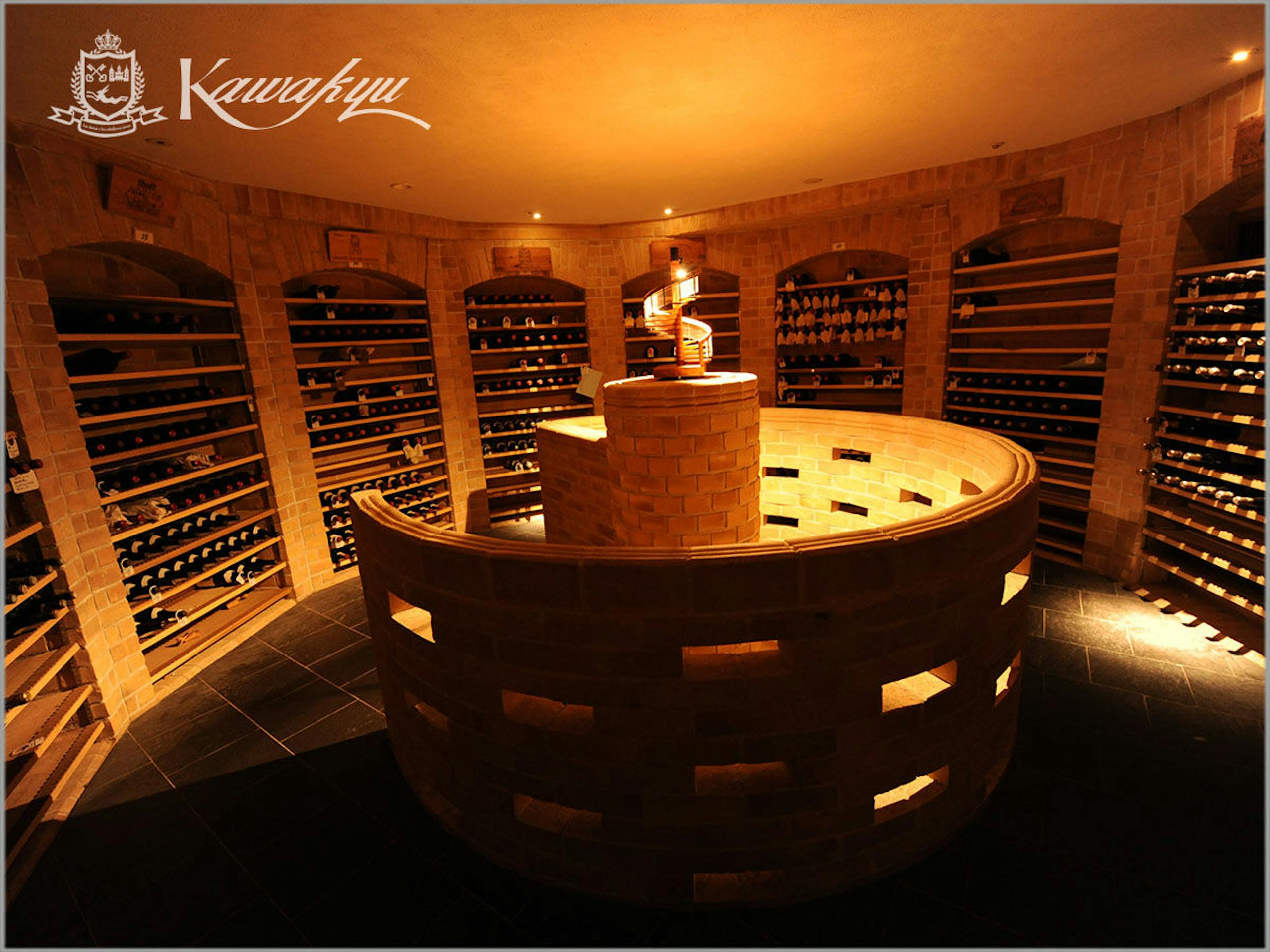 注目はお城の中の隠れた宝部屋のようなスペースのワインセラー。ヨーロッパの小さな美術館や伝統と格式ある図書館をイメージして設計されたのだそう。中にはヴィンテージワインを約5,000本や川久オリジナルワインなども収蔵しています。