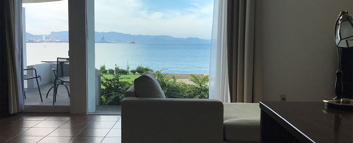 泊まるのは瀬戸内海に面した海辺のお部屋で、フランスの田舎を思わせる居心地の良い部屋はすべてスイート。 緑の島がゆったりと連なる海に船が行き交う窓からの景色。夜には海越しに届く街の光が心地よいです。