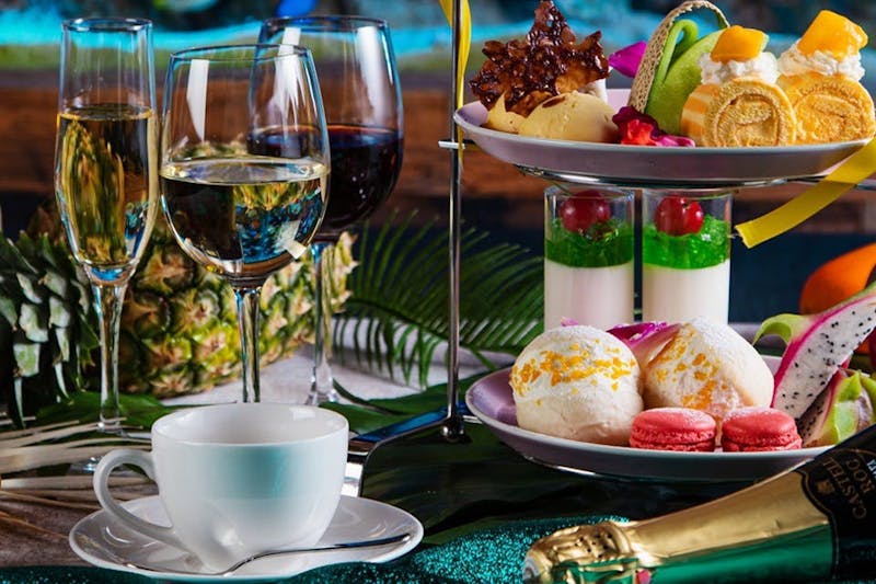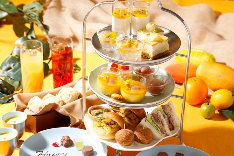 トロピカルフルーツのアフタヌーンティープラン「アクアリウム・アフタヌーンティー」では、写真映えするティースタンドでロマンチックなアクアリウムティータイムを堪能できます。メロンのタルトやマンゴーのロールケーキ、自家製のパルフェなどに加え、フレッシュメロンなど色鮮やかなスイーツとセイボリー全10種を味わえます。