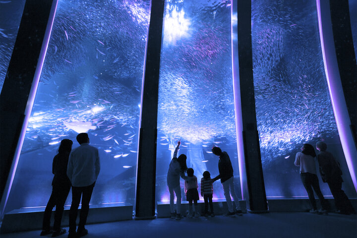 このほか水族館内でも、さまざまなイベントを開催しています。 水族館「アクアミュージアム」にある高さ8m、水量1500トンの大水槽「大海原に生きる群れと輝きの魚たち」では、国内最多飼育数 5万尾のイワシが音楽や照明に合わせ乱舞する「スーパーイワシイリュージョン」を毎日開催しています。 期間中の「スーパーイワシイリュージョン ~rain~」は、大水槽全体が五月雨やあじさいをイメージした青色や紫色といった淡いライティングとなり、降りそそぐ雨のようにイワシがキラキラと輝く圧巻のショーとなります。