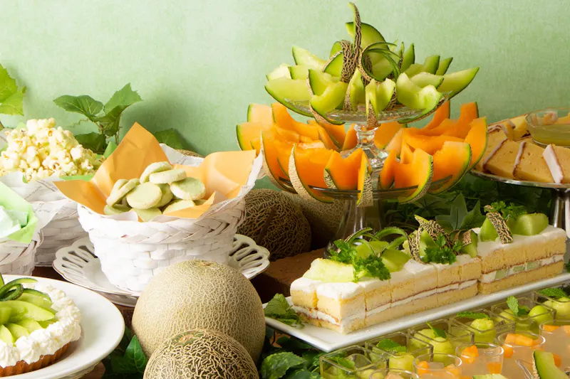 メロンがたっぷりとデコレーションされた宝石のようなタルトやチーズケーキ、ギフトボックスをかたどったメロンショートケーキなど、見た目にも華やかなスイーツがビュッフェボードを彩ります。ミントが爽やかに香るチョコミントのカップケーキと、アイス、鮮やかなブルーが目にも涼しいライムゼリーなど、暑い夏に涼を感じるスイーツも登場。