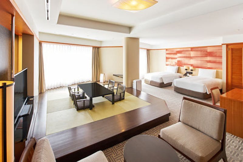 全室サウナ・ジェットバスを完備した80平米以上の広々としたスイートルームは、「和敬清心」をコンセプトに、茶室の侘び寂びに代表される精神性、自然への想いや光の演出など、落ち着いた空間となっています。
