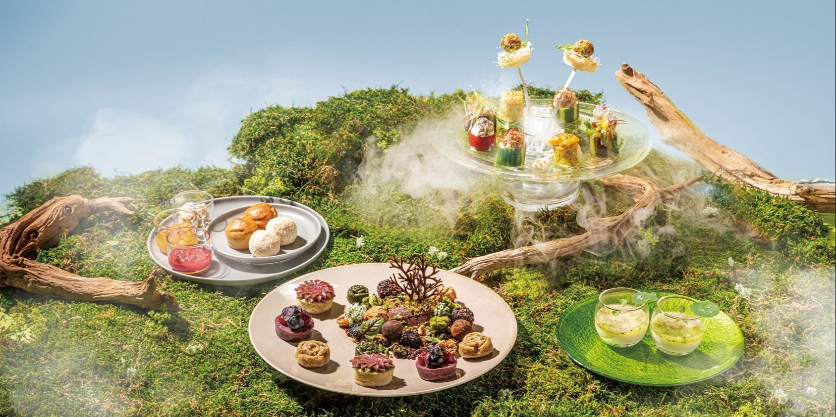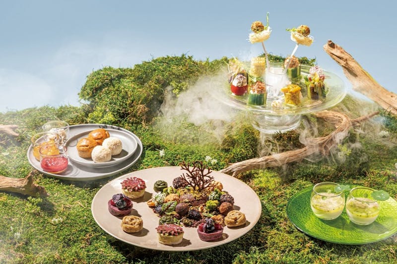 「ザ・プリンスギャラリー 東京紀尾井町」の洋食ダイニング「オアシスガーデン」で6月1日(水) ~ 8月31日(水)に開催するのは、地上約 180mに浮かぶ空中庭園をイメージした 100%植物性のヴィーガンアフタヌーンティー「Floating Garden ~ Vegan Afternoon Tea ~」。