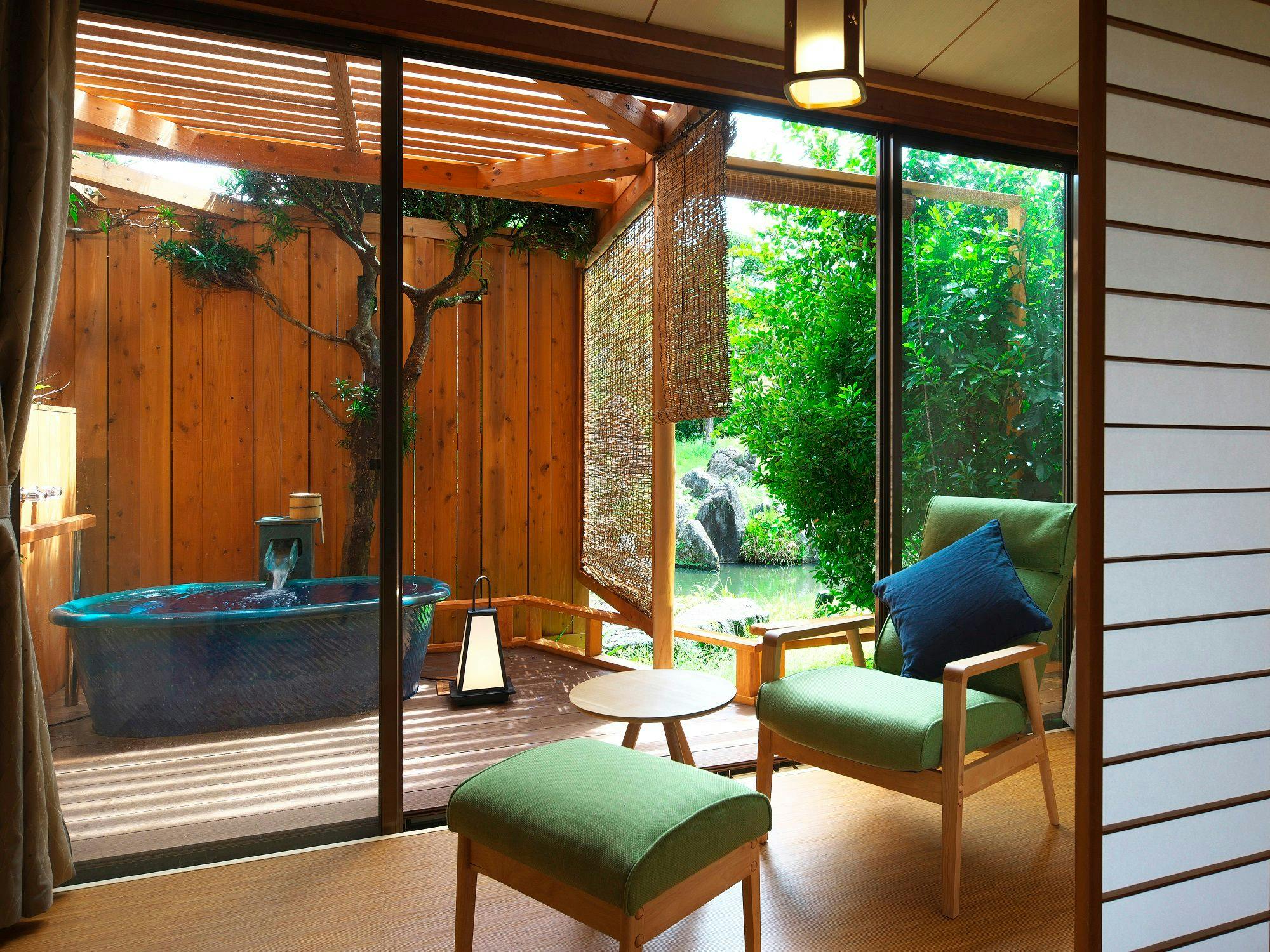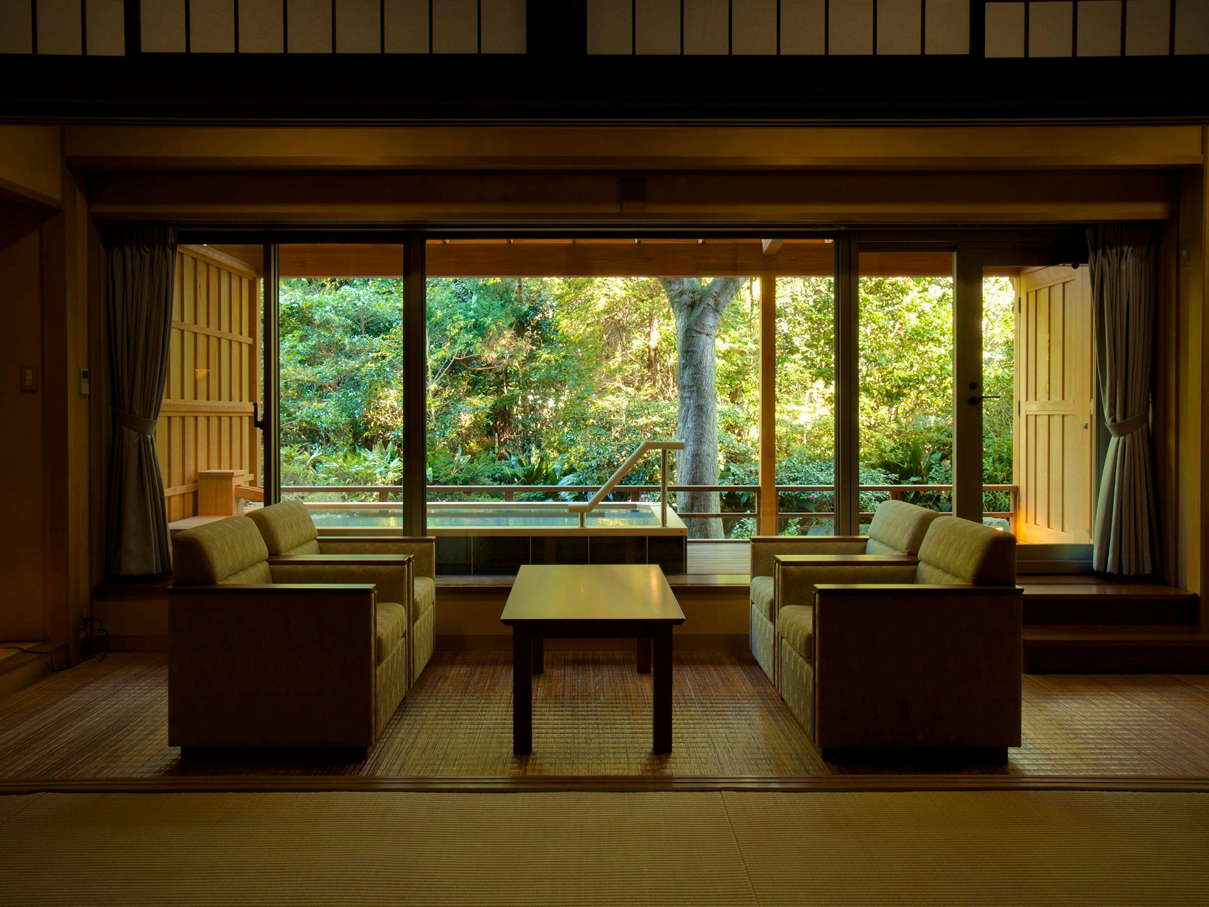客室は竹林と池をかたわらに1室50坪余の数奇屋造りに庭園を望む露天風呂が付いている「貴賓室」や、緑に囲まれた静かな落ち着いた数奇風造りの和室「特別室」、24時間掛け流しの露天風呂を存分に楽しめる「源泉かけ流し露天付き和洋室」などがそろいます。
