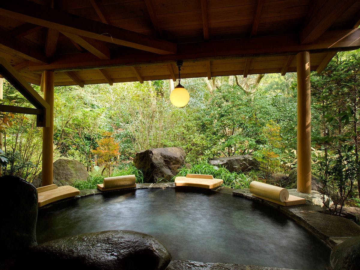 全てのお部屋に檜の内湯と庭園露天風呂を完備。下田の優しい湯を掛け流した天然温泉の露天風呂を好きな時間に、心おきなく楽しめます。