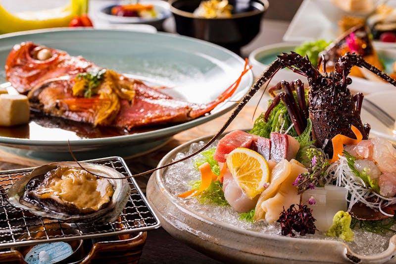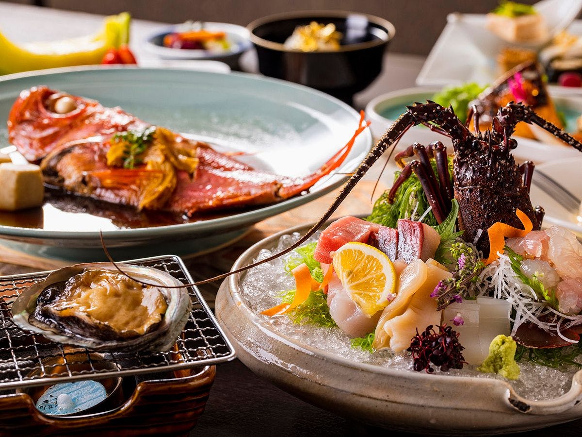 水質検査AA獲得の白砂ビーチを見渡す全室オーシャンビューの湯宿「伊豆下田温泉 下田大和館」。絶景の温泉を楽しんだ後は、山海の幸に舌鼓。料理は海産物などを炭火で炙る炭火会席と伝統の磯会席の2種類から選べます。