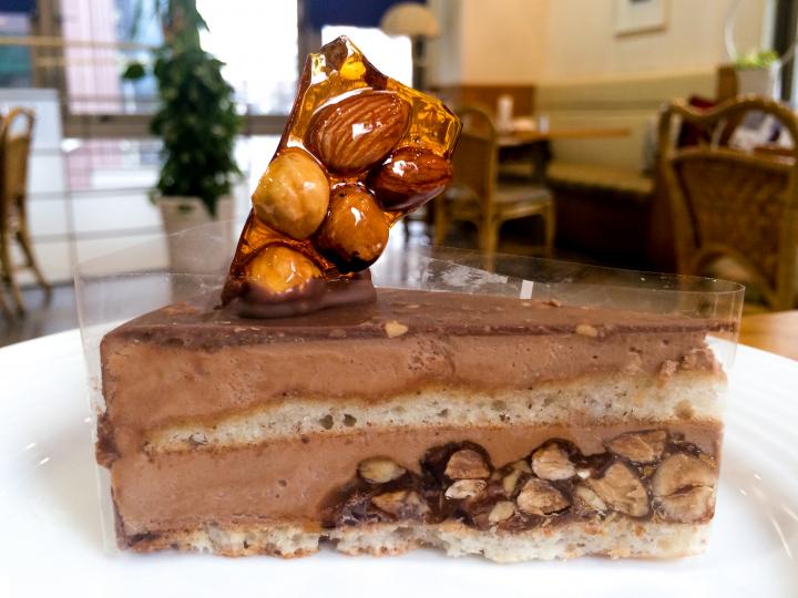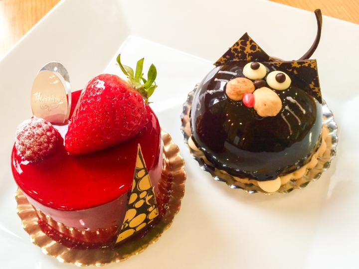 愛くるしい表情をした猫がかわいい「ミロワールショコラ」(410円)の中身は、贅沢にも8層になっています。 一番下にはアーモンドとバターを練った生地、その上にベルギー産のチョコレートを使用したソースやムースなどが層を成していて、最後に濃厚なアングレーズソースをたっぷりコーティング。ちょっぴり大人のケーキです。