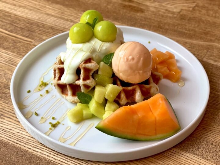 自由が丘の「なんとかプレッソ」と「パンとエスプレッソと自由形」、渋谷の「なんとかプレッソ2」「パンとエスプレッソとまちあわせ」では、毎月旬なフルーツを使った限定スイーツを展開中。今月は、生メロンクリームソーダやメロンムッフルなど、いましか食べられないメロンスイーツが集合する「メロンフェア」を期間限定で開催しています。(※各店舗ごとに展開しているフェアメニューは異なります。) 「パンとエスプレッソと自由形」では、人気の食パン「ムー」の生地をワッフル型で焼き上げ、肥後グリーンメロン、赤肉メロン、メロンクリーム、北海道メロンアイス、蜂蜜、ピスタチオ、ミントをトッピングした「メロンムッフル」が登場します。爽やかなメロンの甘味と肉厚メロン果肉がムッフルと合った贅沢なワンプレートです。 また、ごろっと生メロン果肉がそのまま入ったスペシャルな「生メロンクリームソーダ」や、まるでメロンを食べているかのような「メロンシェイク」も登場します。