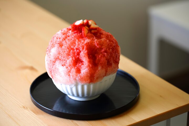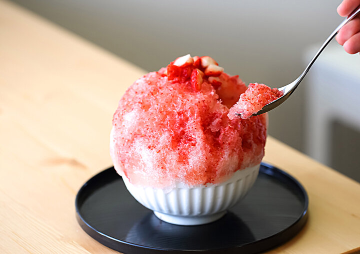 もちろん氷にもこだわりがあります。通常は奈良の日之出製氷さんの純氷を使用、プラス200円で八ヶ岳の蔵元八義(やつよし)さんの天然氷に変更もできます。 「爽やかなフルーツを使ったかき氷には口どけのよいふわふわの天然氷、とろとろのクリームなどのもったり系のものには純氷が合いますよ」と店長の鹿間さん。味というより口どけがポイントのようです。 スプーンを氷に入れると、氷がまるでないかのように何の抵抗もなく氷をすくうことができました。細雪のような氷に、いちごソース、自家製の練乳もたっぷり。これからの季節は夏いちごが使われます。