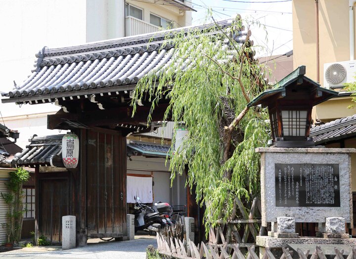 大門と風にそよぐ柳が往時の賑やかさを伝える