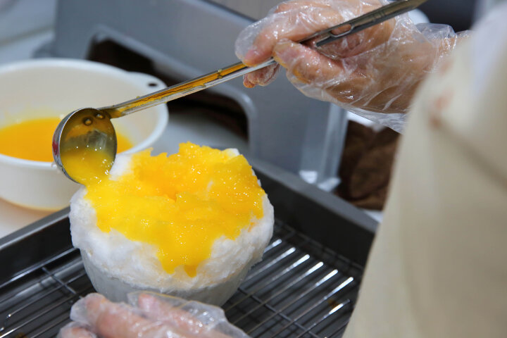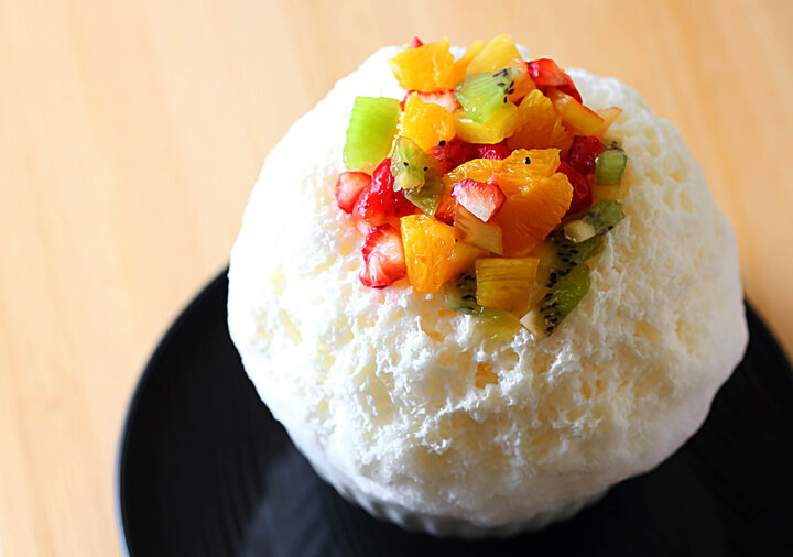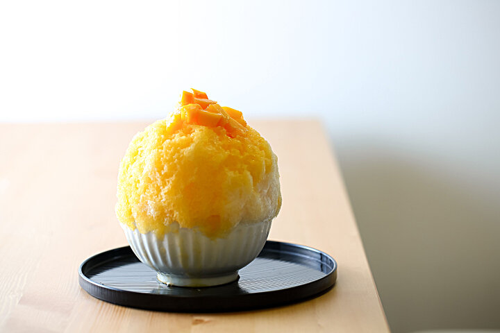 ふわふわに削った氷に、たっぷりと蜜をかけ、フレッシュフルーツをトッピングした完熟マンゴーを贅沢に使ったかき氷。濃厚な甘さと芳醇な香りがふわりと漂うトロピカルな一品です。火を通さないので、旬の果物の味がそのままにギュッと濃縮されていますよ。